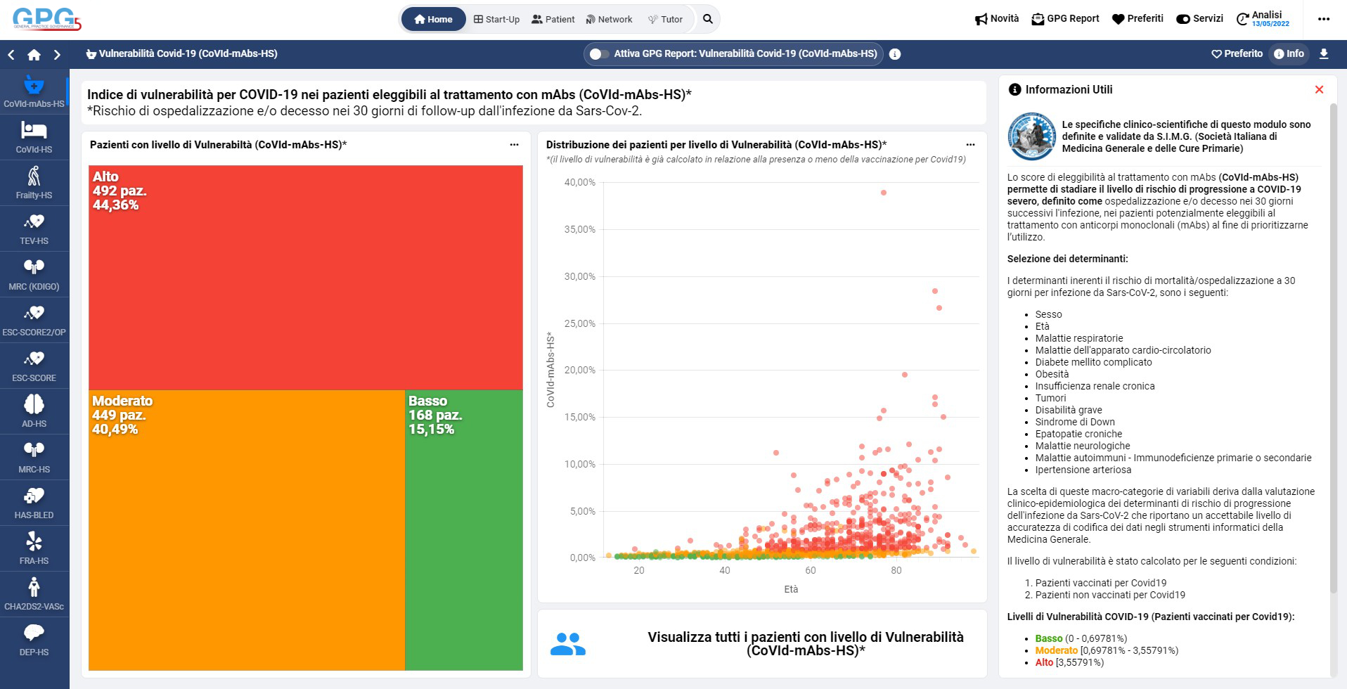 - CoVId-mAbs.HS: : Indice di vulnerabilità per COVID-19 nei pazienti eleggibili al trattamento con mAbs (CoVId-mAbs-HS)* .*Rischio di ospedalizzazione e/o decesso nei 30 giorni di follow-up dall’infezione da Sars-Cov-2. Lo score di Vulnerabilità Covid-19 (CoVId-mAbs-HS) permette la stadiazione e prioritizzazione di interventi di medicine di iniziativa nella popolazione candidata alla terapia con anticorpi monoclonali (mAbs) alla luce della loro sovrapponibile importanza con quanto osservato per i pazienti con Sars-CoV-2 vulnerabili a rischio di infezione COVID-19.