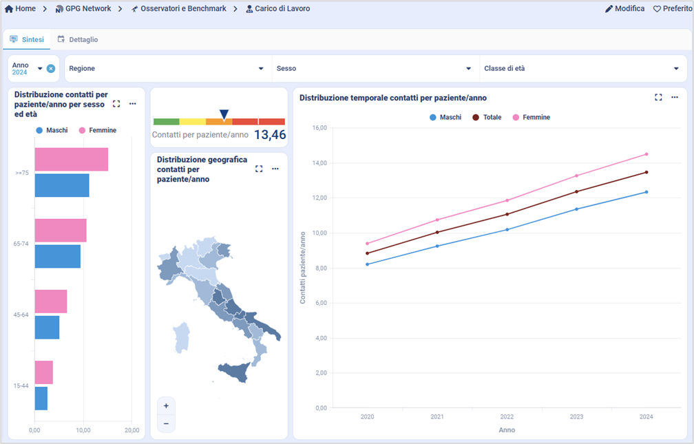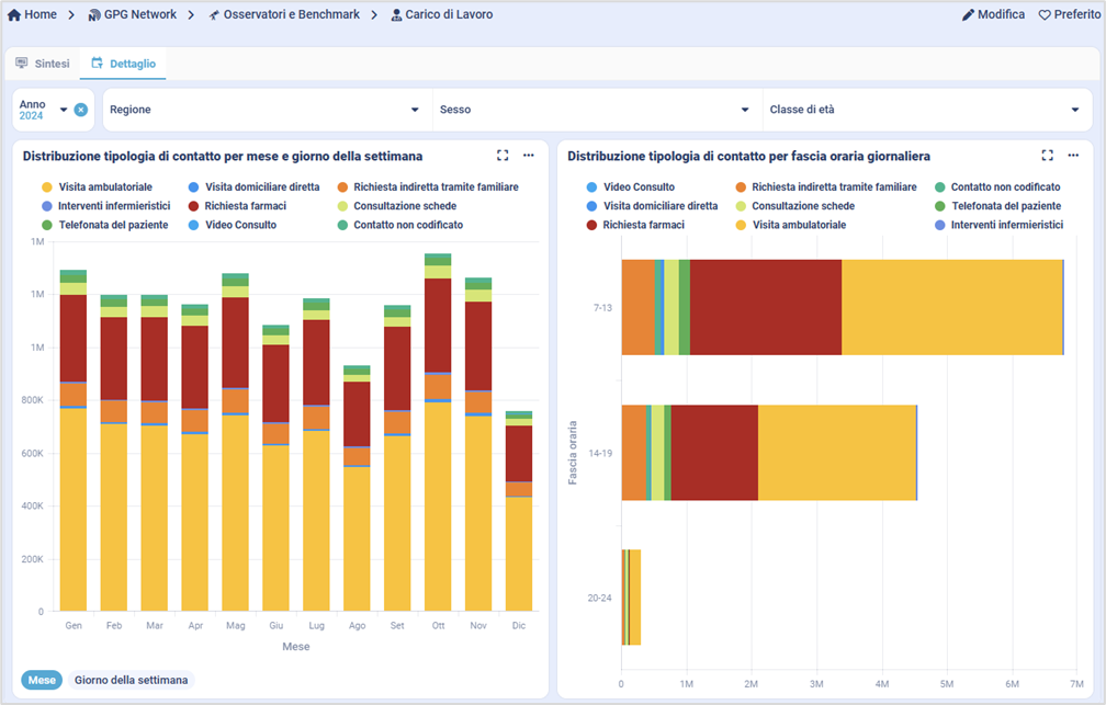 7. Inserimento nella sezione Osservatori e Benchmark, del GPG Network, di un nuovo Osservatorio sul Carico di Lavoro, che permette di avere una visione complessiva, in termini di numero di contatti medi per paziente/anno, nonché dettagliata a livello di tipologia di contatto con stratificazione per mese o giorno della settimana e per fascia oraria giornaliera.