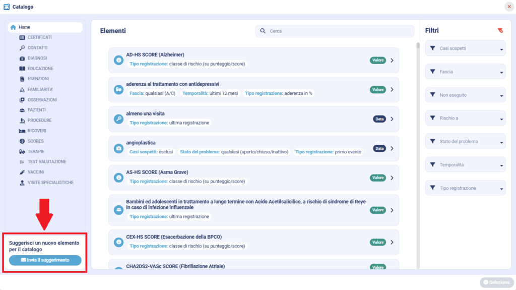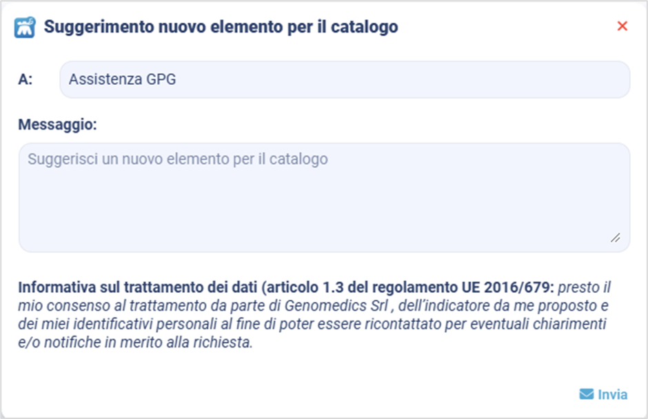 4. Self-service => Liste personalizzate: attraverso l’apposito form è possibile richiedere all’assistenza GPG, un qualsiasi elemento (diagnosi, terapie, procedure ecc) mancante nel catalogo dei criteri ad oggi presente