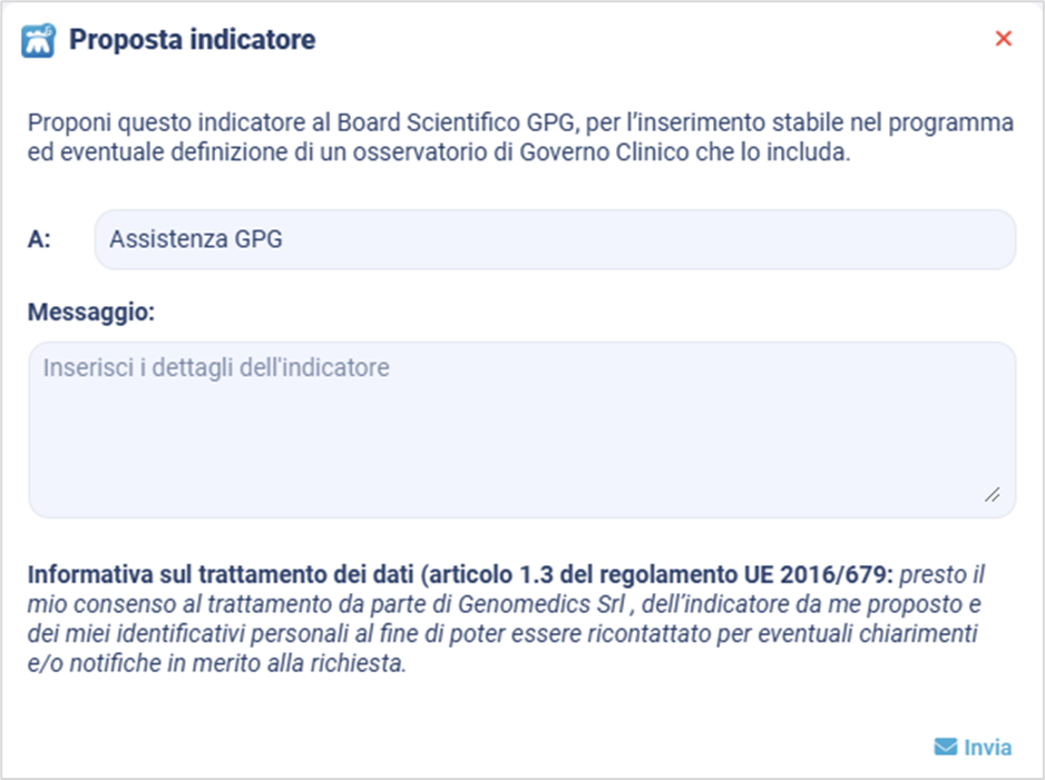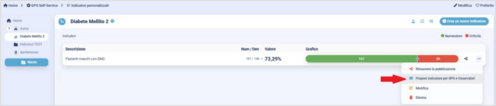 5. Self-service => Indicatori personalizzati: nuova funzionalità che permette all’utente di proporre al Board Scientifico di GPG indicatori personalizzati da implementare all’interno del GPG e in Osservatori e Benchmark.