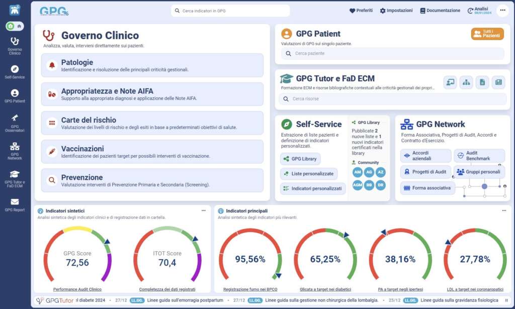 - NUOVA VESTE GRAFICA : La nuova interfaccia grafica di GPG6 favorisce un utilizzo “integrato” dei diversi moduli secondo percorsi logici, obiettivi professionali e strategie di miglioramento individuali – abilitando inoltre ipotesi di ricerca clinica sul campo e offrendo la possibilità di sviluppare progetti di audit completamente personalizzati. Maggior semplicità e velocità per raggiungere tutte le funzioni disponibili.