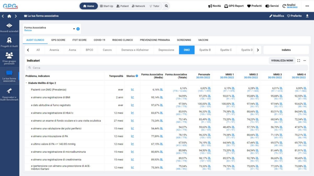 Abbiamo visto(Figura 2)come GPG renda possibile questo tipo di confronto riportando, per tutti gli indicatori, gli standard di riferimento proposti dalla SIMG (Società Italiana di Medicina Generale) ed i valori mediani ricavati dal database di Health Search. Per quanto determinati con metodologia rigorosa, però, questi valori di riferimento possono apparire non adeguati alla particolare situazione operativa di ciascun medico e al suo percorso di qualità che potrebbe essere meglio valutato mediante un confronto storico con i dati precedenti (Figura 3). Ancora più interessante e utile può essere il confronto con i colleghi con i quali si condivide un’esperienza di audit clinico. All’interno di un gruppo di lavoro, infatti, possono realizzarsi condizioni ideali perché un processo di revisione periodica della pratica clinica si trasformi in un percorso di formazione e di crescita professionale continue.