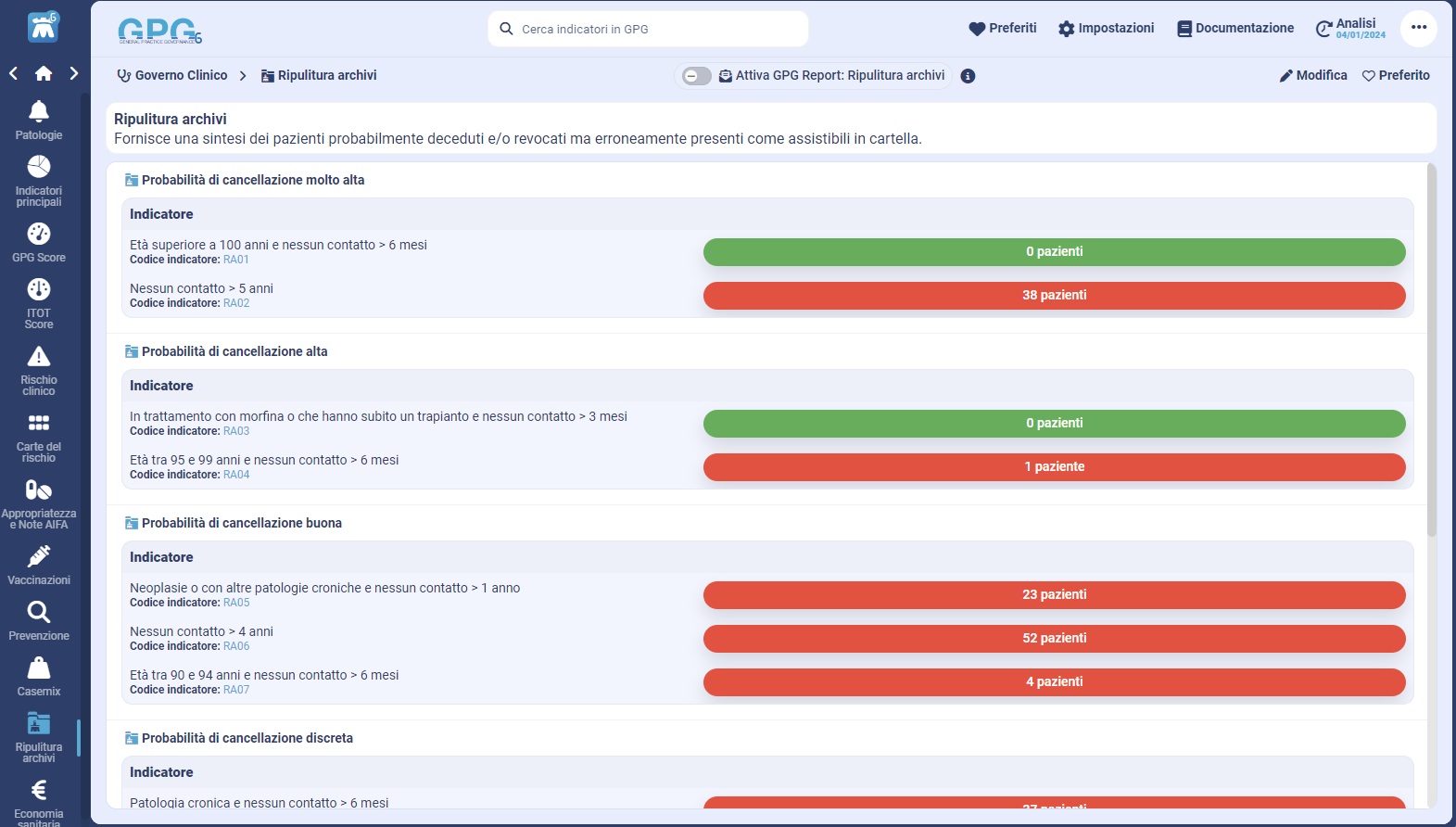 Ne deriva che, se deceduti e revocati rimangono nella lista dei pazienti attivi, il numeratore resta inalterato, perché deceduti e revocati non presentano ovviamente dati registrati recentemente, mentre il denominatore è falsamente aumentato. Come risultato otterremo una sottostima del valore dell’indicatore.