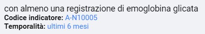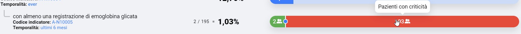misura la percentuale e identifica a sua volta i pazienti diabetici che hanno almeno una registrazione di emoglobina glicata negli ultimi sei mesi. Il segmento rosso dell’istogramma visualizza il numero delle criticità gestionali, dunque, il numero dei pazienti che non hanno registrazione della glicata negli ultimi sei mesi. Il clic del mouse sull’area rossa