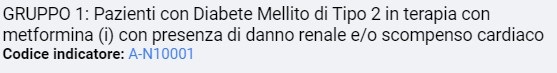 è possibile valutare il gruppo dei pazienti in trattamento con metformina che presentano anche danno renale e/o scompenso cardiaco. Per questi pazienti la nota 100 indica preferenzialmente il trattamento aggiuntivo di prima scelta con SGLT2i o GLP1-RA come farmaco di seconda scelta. Viene visualizzato il numero totale dei pazienti individuati e nelle colonne la stratificazione dei pazienti raggruppati secondo la classe di farmaci assunti e secondo il compenso metabolico (campi di colore verde). I DPP4 sono farmaci di terza scelta. L’ultima colonna, sempre con numero in campo verde, individua i pazienti in trattamento con sola metformina che hanno ultimo valore di emoglobina glicata a target. Acarbose, Pioglitazone e insulina sono farmaci di quarta scelta; tali pazienti (campo di colore grigio) potrebbero avere controindicazioni o intolleranza agli altri farmaci. Ciascuna colonna mostra il numero dei pazienti individuati ed è possibile visualizzarne l’elenco con un semplice clic del mouse. La colonna con numero in campo rosso indentifica i pazienti con criticità: sono quei pazienti che pur in trattamento con metformina non raggiungono l’obiettivo di cura. Si tratta dei pazienti eleggibili al trattamento con SGLT2i o GLP1-ra per i quali è necessario intervenire prioritariamente.