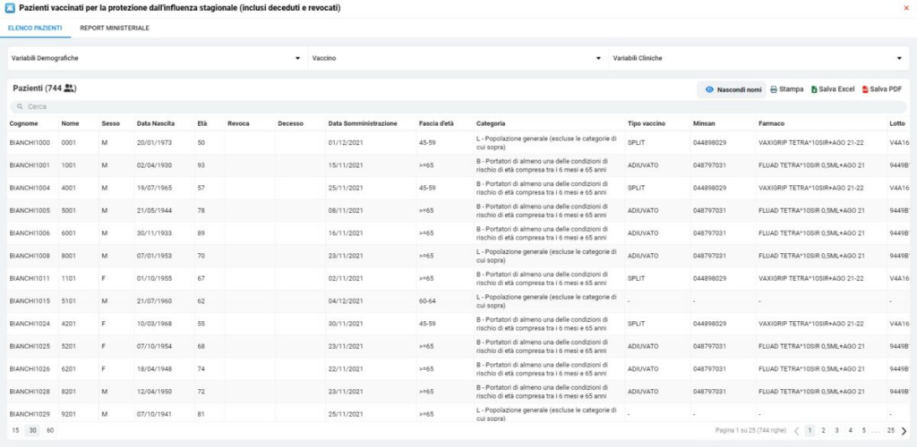 A campagna vaccinale terminata, è possibile generare una reportistica completa(Figura 24)in cui i pazienti sono elencati individualmente con l’indicazione della categoria di rischio cui appartengono e del tipo di vaccino che è stato somministrato (nella Figura i campi cognome, nome “data dì nascita” e “codice fiscale” sono stati volutamente compressi od omessi per motivi di riservatezza).