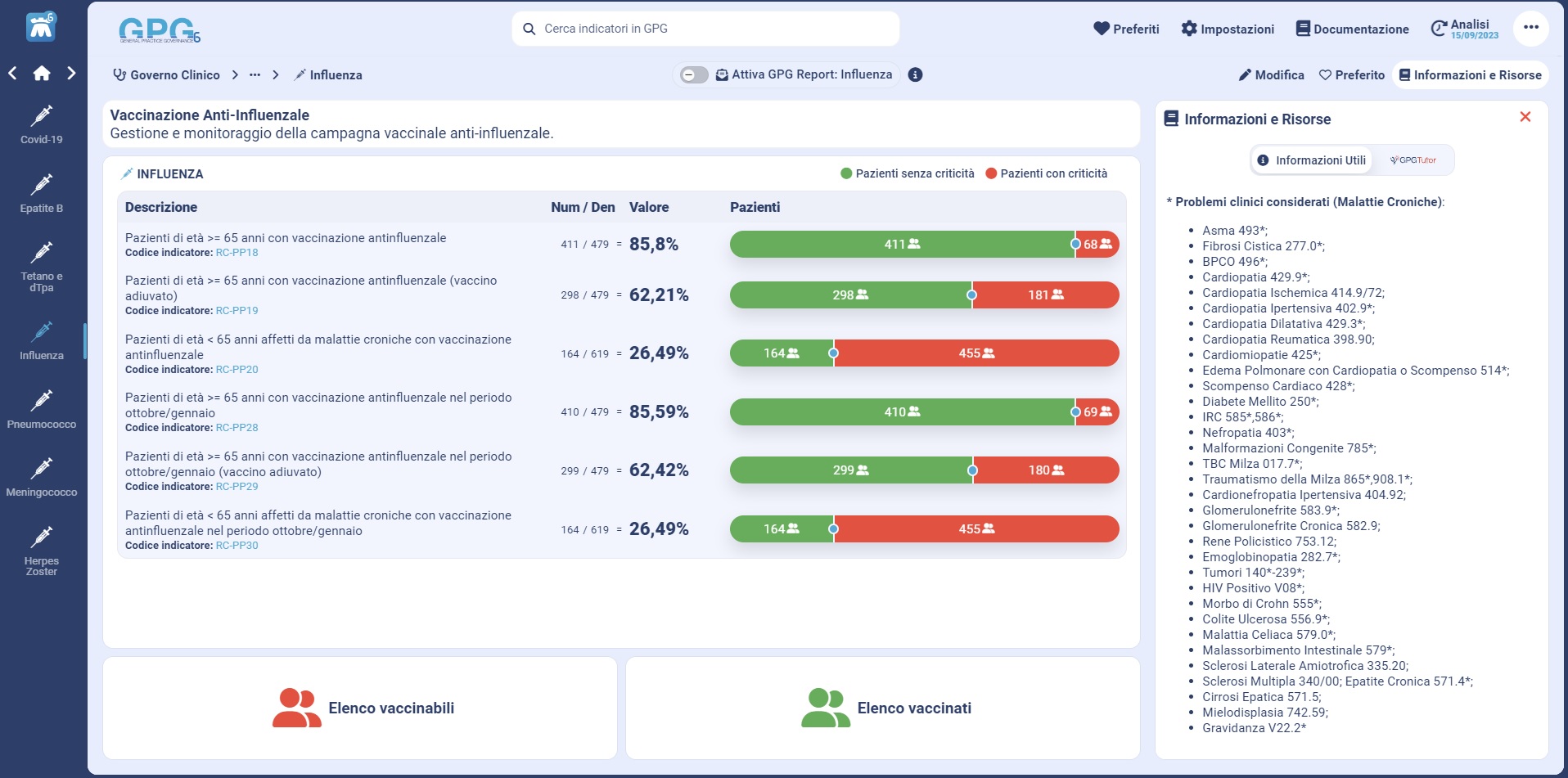 in particolare sono disponibili due procedure dl interrogazione degli archivi della cartella clinica che producono rispettivamente l’elenco dei pazienti ultrasessantacinquenni, per i quali la vaccinazione antiinfluenzale è sempre indicata RC-PP18, e l’elenco dei pazienti di età inferiore a 65 anni per i quali la vaccinazione è indicata in presenza di patologie croniche concomitanti RC-PP20, rappresentati nella casella a sfondo rosso.