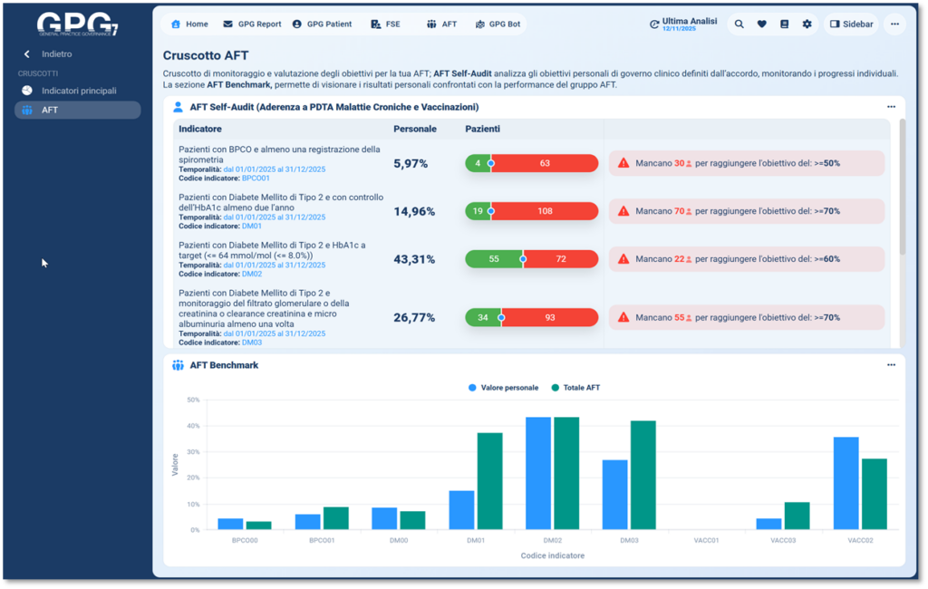 Il Cruscotto AFT di sintesi è la vista operativa per monitorare e valutare in modo continuo gli obiettivi della tua AFT. Qui trovi, in un colpo d’occhio, gli indicatori chiave e lo stato di avanzamento rispetto ai target concordati. AFT Self-Audit ti aiuta a leggere gli obiettivi personali di governo clinico e a seguire i progressi nel tempo, evidenziando immediatamente scostamenti e aree prioritarie su cui intervenire.