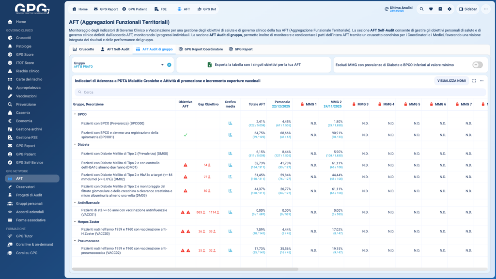 La sezione AFT Audit di gruppo, permette di monitorare e rendicontare i patti dell’intera AFT tramite un cruscotto condiviso per i Coordinatori e i Medici, favorendo una visione integrata dei risultati e delle performance del gruppo.