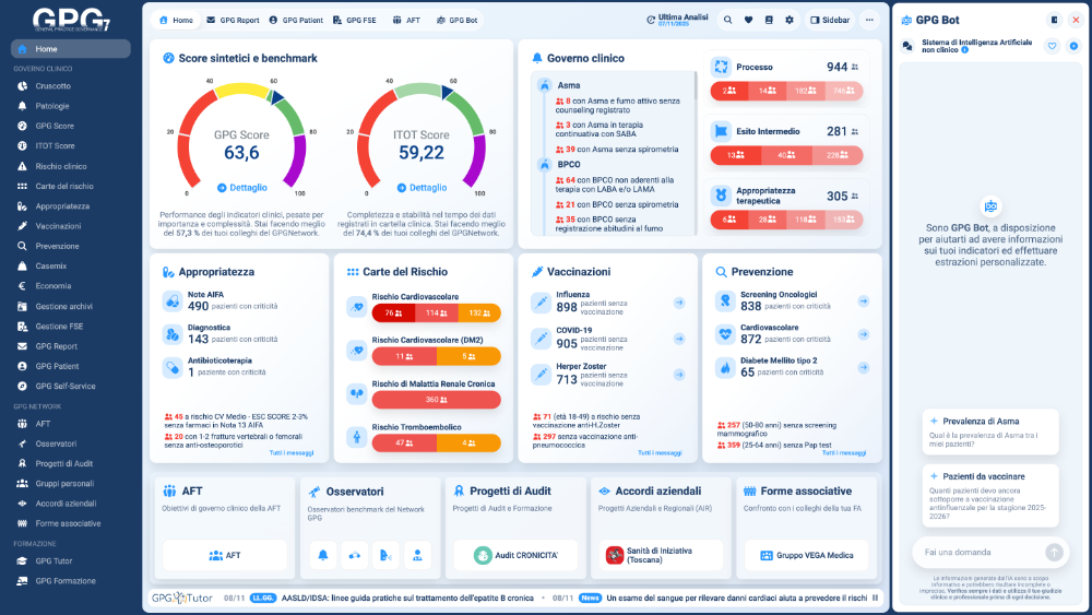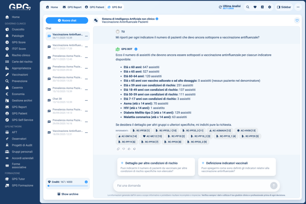 GPG Bot è totalmente integrato nel programma e consente di esplorare le performance dei propri indicatori, offrendo approfondimenti supportati da evidenze scientifiche e un accesso immediato alle evidenze di letteratura più rilevanti.